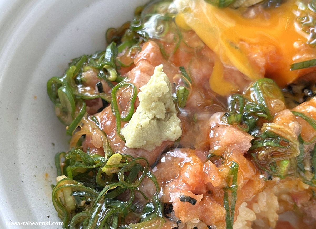 まぐろたたき丼にこれをトッピングすればまぐろユッケ丼+青ねぎになるのでは?と思い、違いを確認することも含めて「まぐろたたき丼+ねぎ玉」で注文しテイクアウトしてみました。