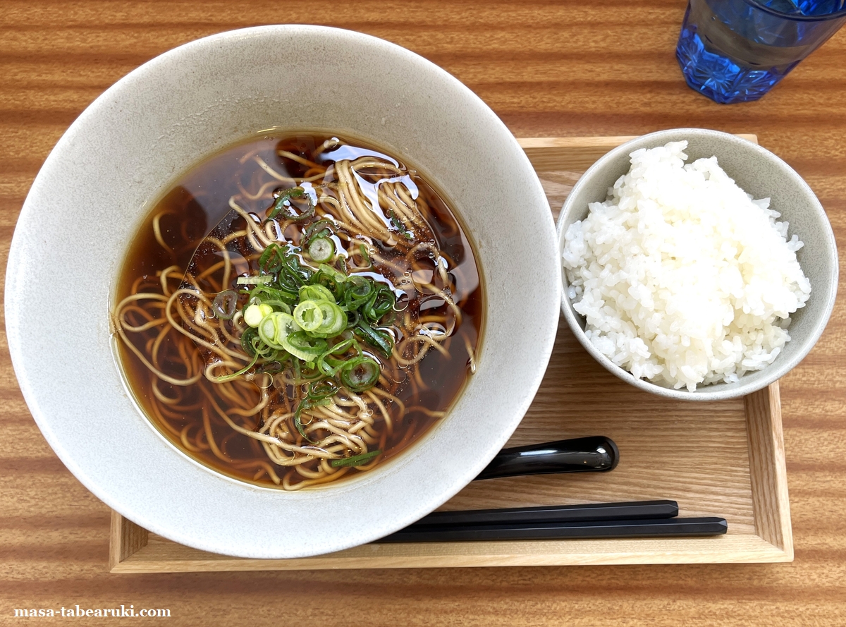 麺は細めで歯切れの良さもあり、あっさりめのスープとの相性は良い感じ。大盛の設定は無さそうで量的にはそれほど多くはありません。スープは鶏ガラとあご出汁を使用されているとのことで、あっさりしているものの旨味は感じられます。表面に浮いているのは鶏油かな?スープに適度なこってり感を付加している印象。