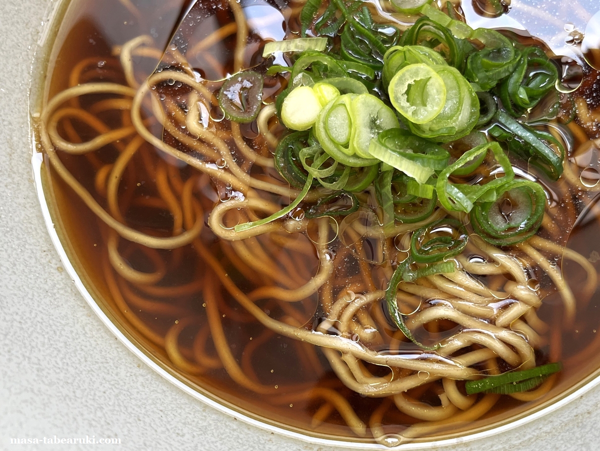 白い丼に黒めのスープが映え、素ラーメンのため載っている具材はネギのみ。スープ表面に浮いた油がキラキラと光ってますね。