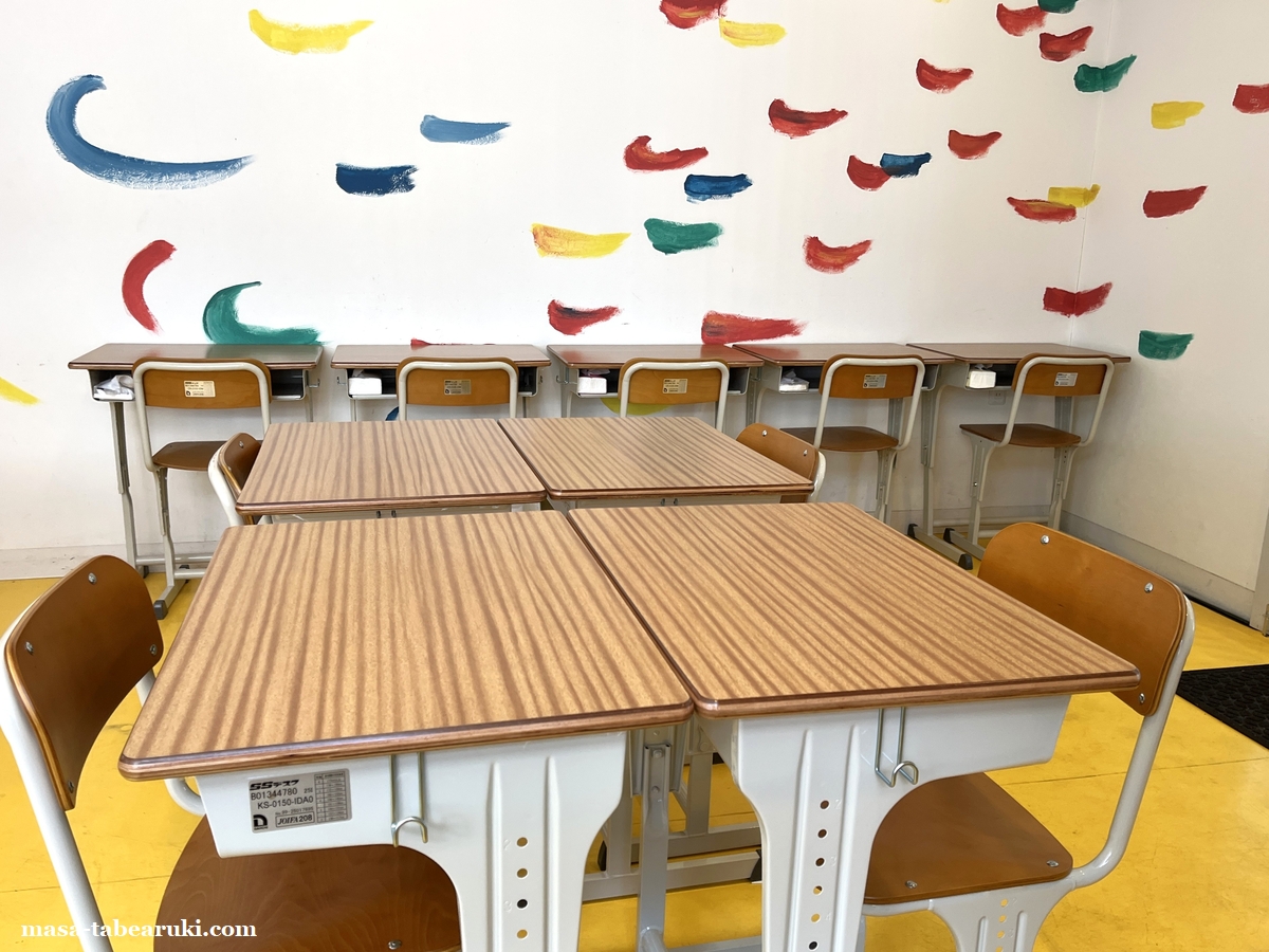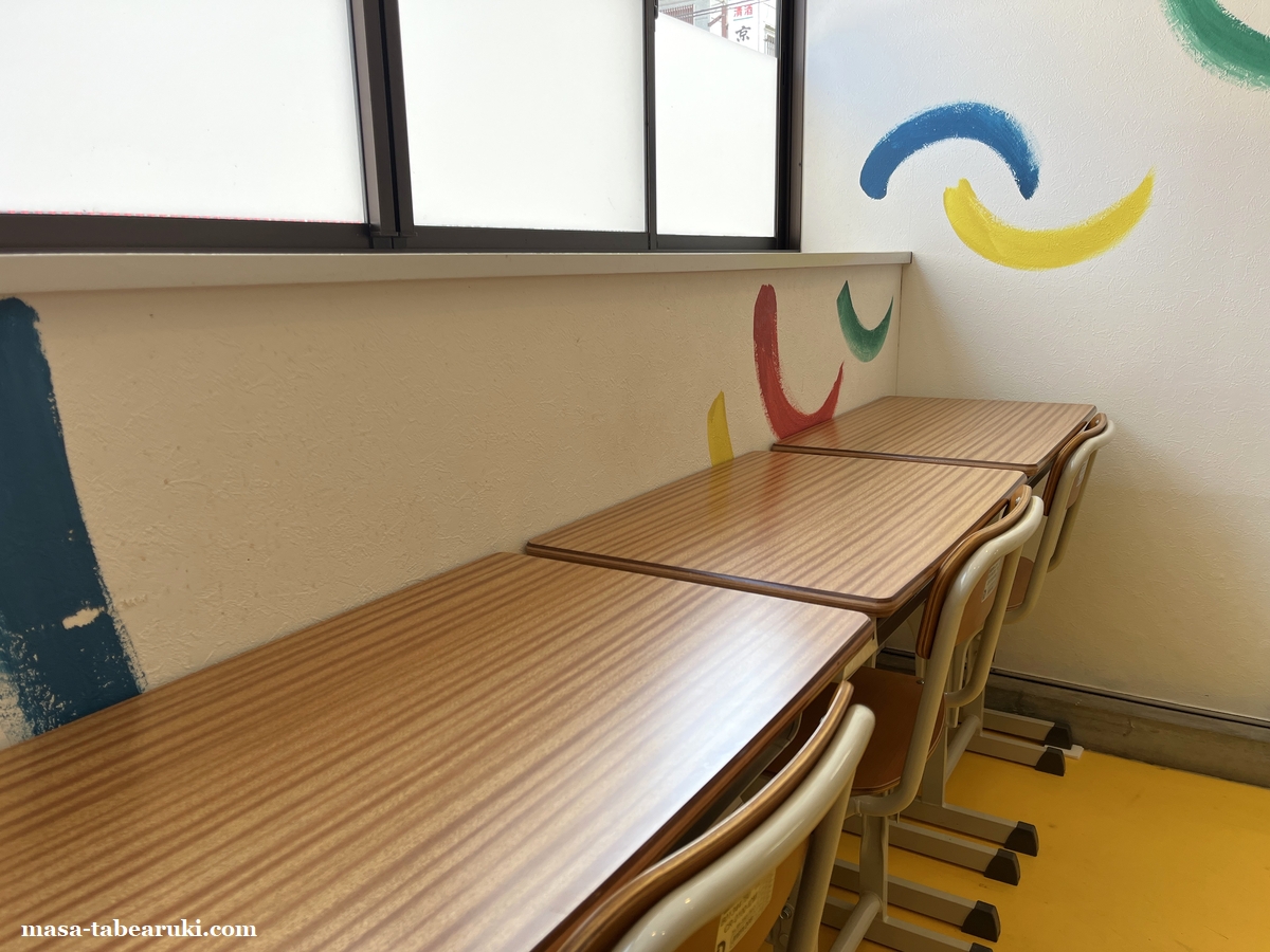最後に店内の雰囲気です。小学校の時に座っていた机や椅子が並べられており、席数は窓側に4席と真ん中に4席、そして壁側に5席の合計13席となっています。