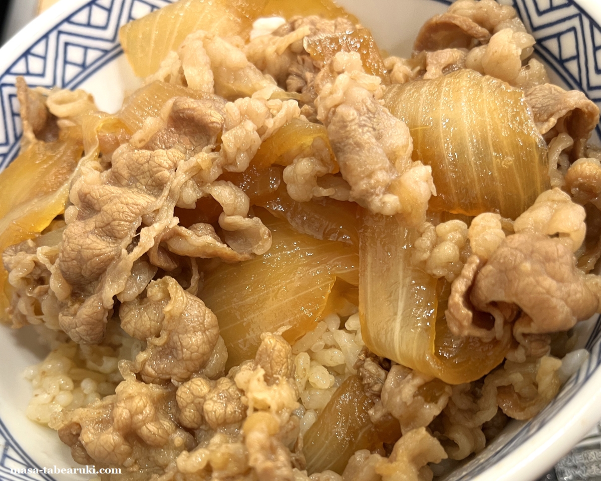 牛丼は並盛サイズでいつもと変わらない印象。ただ今回はつゆだくにしてみたのですが、個人的には普通の方が好みだったかも(以前はつゆだくが好きな時もあったんですが)。