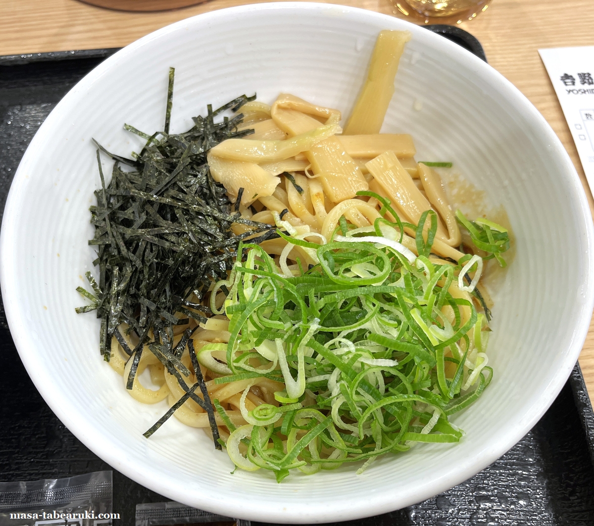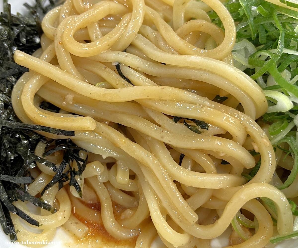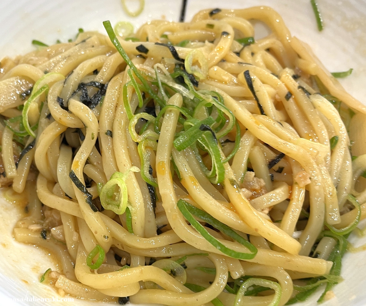 油そばは具材として刻み海苔、ネギ、メンマが載っており、丼の底にはタレがあります。味はそれほど濃いものでは無く油も想像していたよりも優しめであっさりめの油そばに思えます。麺は太麺となっておりモチモチした食感が特長。並盛でも量的にはそれほど多くは無い印象でしょうか。