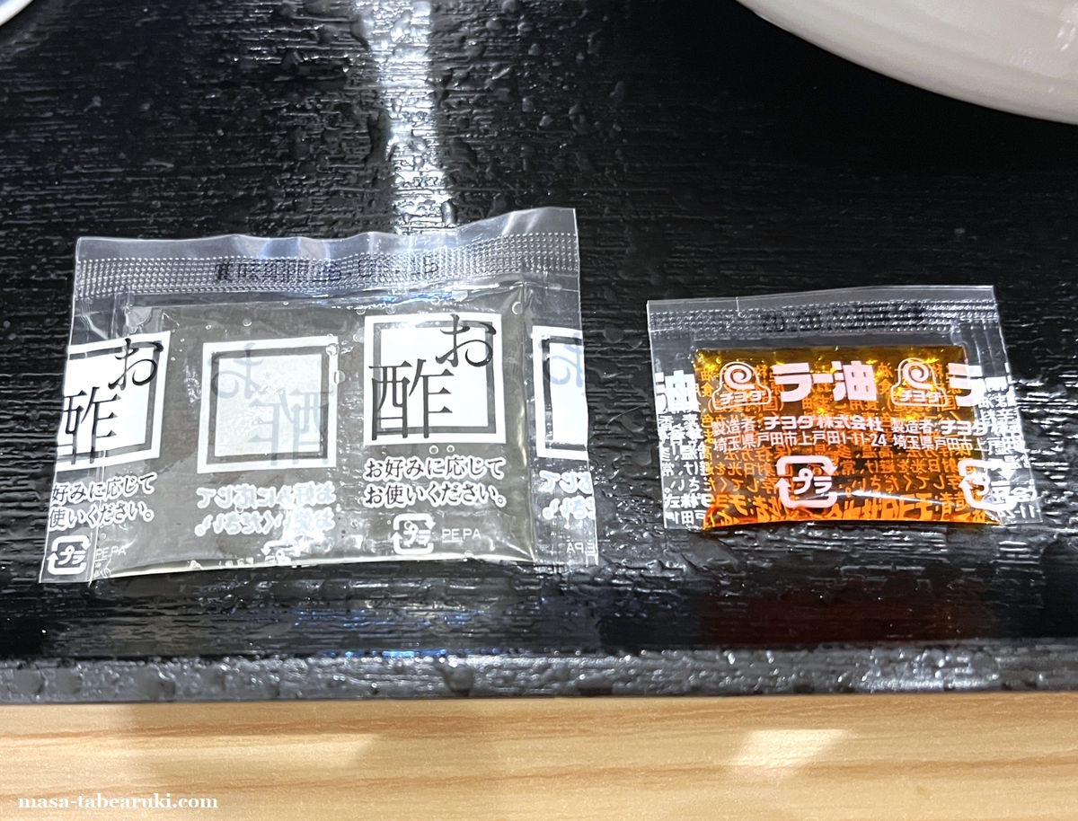 付属している小袋二つはお酢とラー油でした。個人的には量は逆の方が良く、ラー油の方を多くして欲しかったところ。お酢は食べやすくなるものの風味が強いので全部入れるとちょっとキツイくらいに思えます。