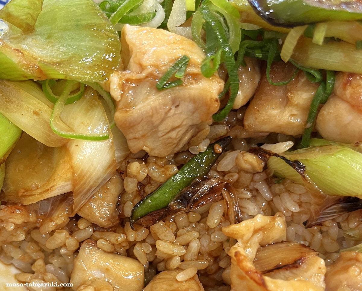 鶏肉は親子丼の時と同じものに思え、食感は不自然なくらいに(笑)柔らかいですね。量的にもあるので食べ応えもまずまずの印象。大きくカットされたネギはところどころ焦がされているので香ばしさがありますが、鶏肉も焦がして欲しかったのが正直なところかな?