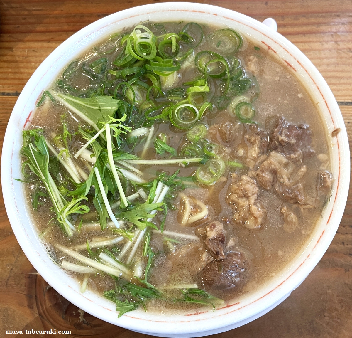 見た目は以前と変わっておらず、すじ肉、ネギ、水菜となっており、以前は味玉を付けましたがそれ以外は全く変わっていない印象です。