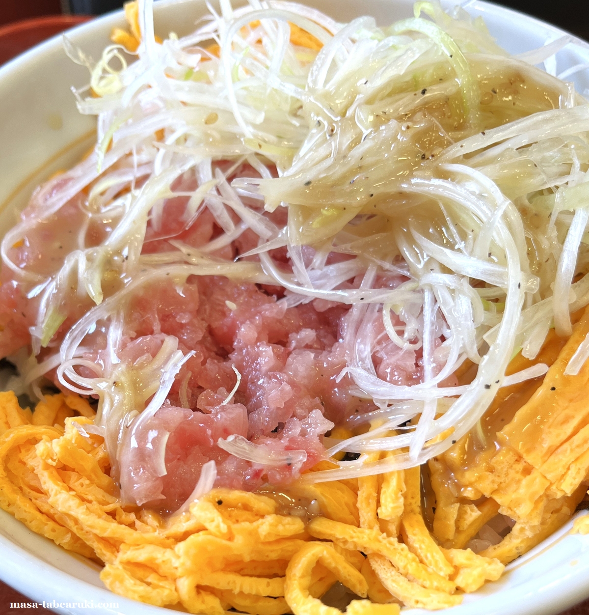 ただ、錦糸卵はこの丼にいるかな?と思ったのが正直なところ。色合いとして鮮やかにするには良いのかもしれませんが、まぐろのたたきとの相性もそれほどでもないと思えました。個人的には錦糸卵は無くして、まぐろのたたきを増量してくれる方がありがたいかな(笑)錦糸卵よりもねぎ塩の方が相性も良いと思えた一杯でした。