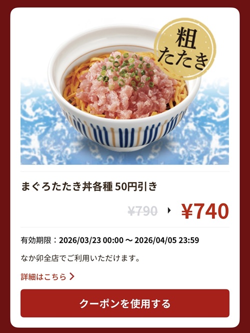 後から気付いたけどこのクーポンも使用出来たんですね。。50円でも値引きは値引き。松屋や吉野家では最初にチェックするけど、なか卯もちゃんとやらないとですね。