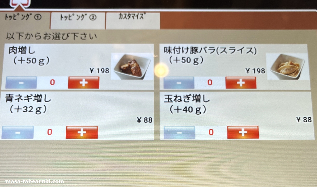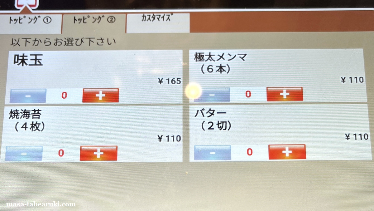 価格は税込み979円とそこそこしますが、このご時世では普通なのかもしれません。油そばにはトッピングが複数用意されており、タブレットで確認すると下記のようなものを提供されています。しかしこれらを付けると軽く千円を超えてしまうので今回は封印。大盛の設定も無いようなので、そのまま何も変更せずに注文し、待つこと7分くらいで到着しました。