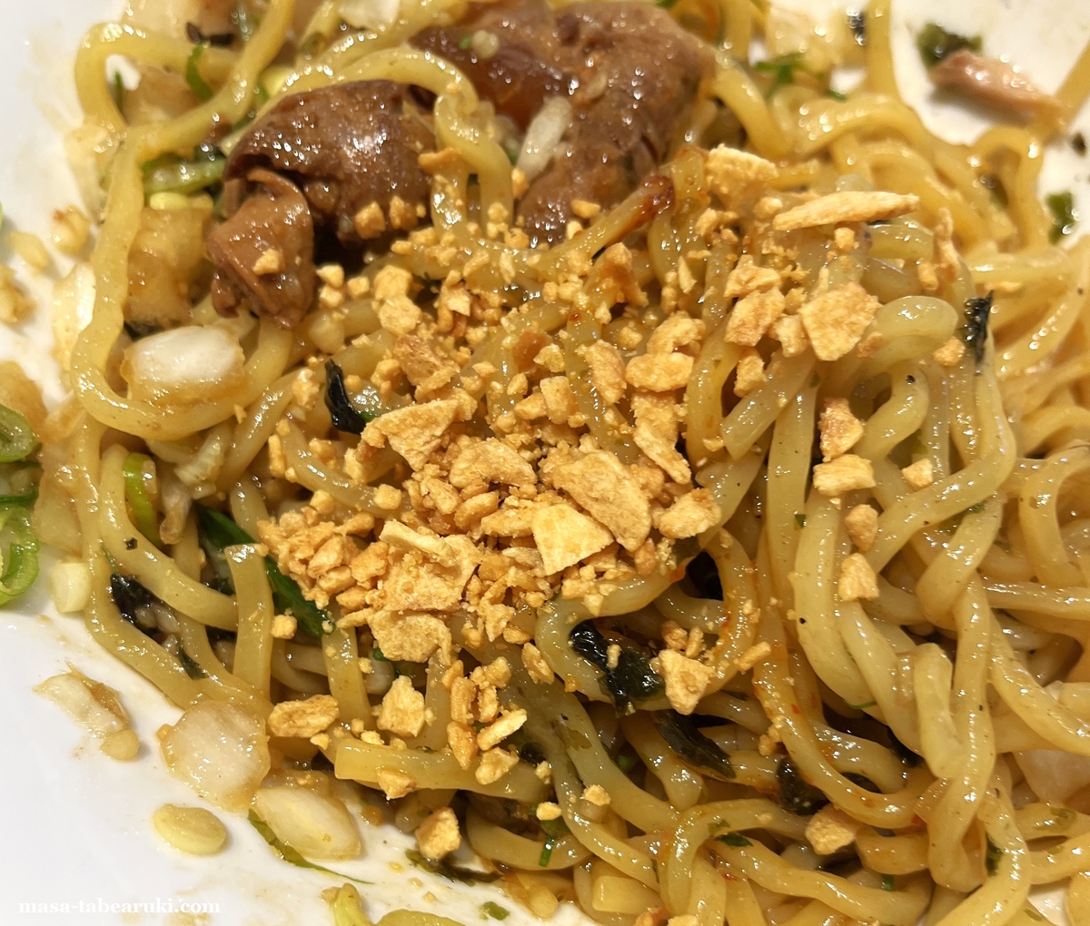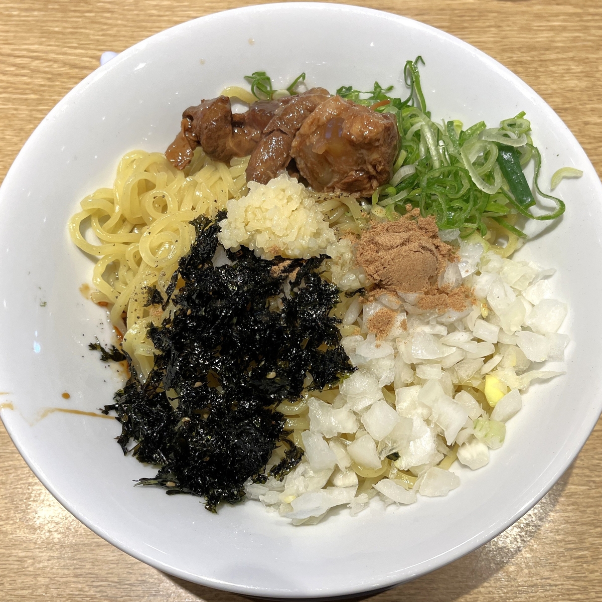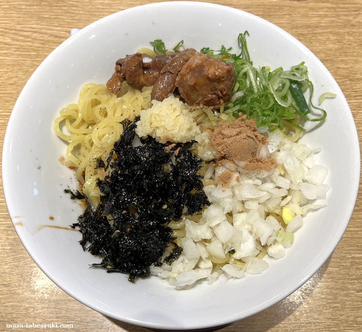 トッピングはデフォでもそこそこ載っており、肉のような塊と玉ねぎ、韓国海苔、青ねぎ、刻んだニンニク、魚粉など。油そばというと具材はシンプルなイメージを持っていましたが意外にこれは多めで、まぜそばに近いものにも思えます。