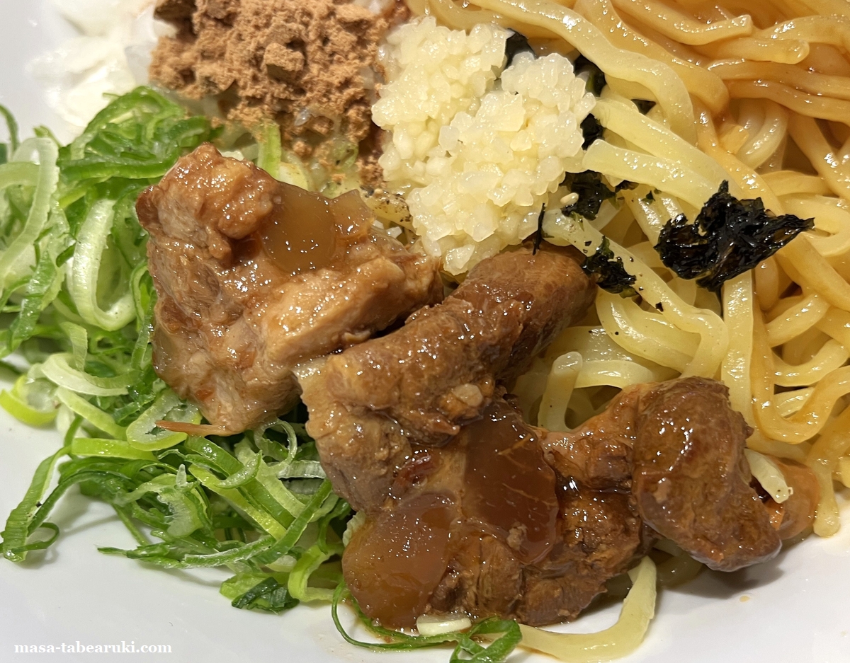 肉の塊は豚バラなんこつで食感はかなり柔らか。味もしっかりと染みており、混ぜる時に崩れてしまうくらいの柔らかさがあります。他にもネギを除くと韓国海苔や刻みニンニク、魚粉、粗くカットされたタマネギとなかなか主張の強い具材が多く載ってます。