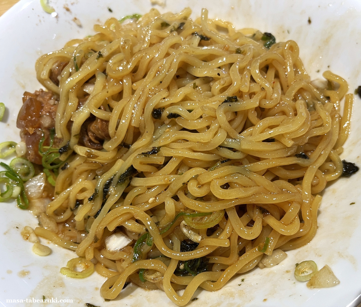油そばやまぜそばは良く混ぜると旨くなるんでこれも良く混ぜます。麺は想像よりも細かったですが丸源のつけ麺で使用されているものと同じように見えます。プリっとした食感があり油そばでも問題ない太さながら、量的にはそれほど多くない印象(私には)。