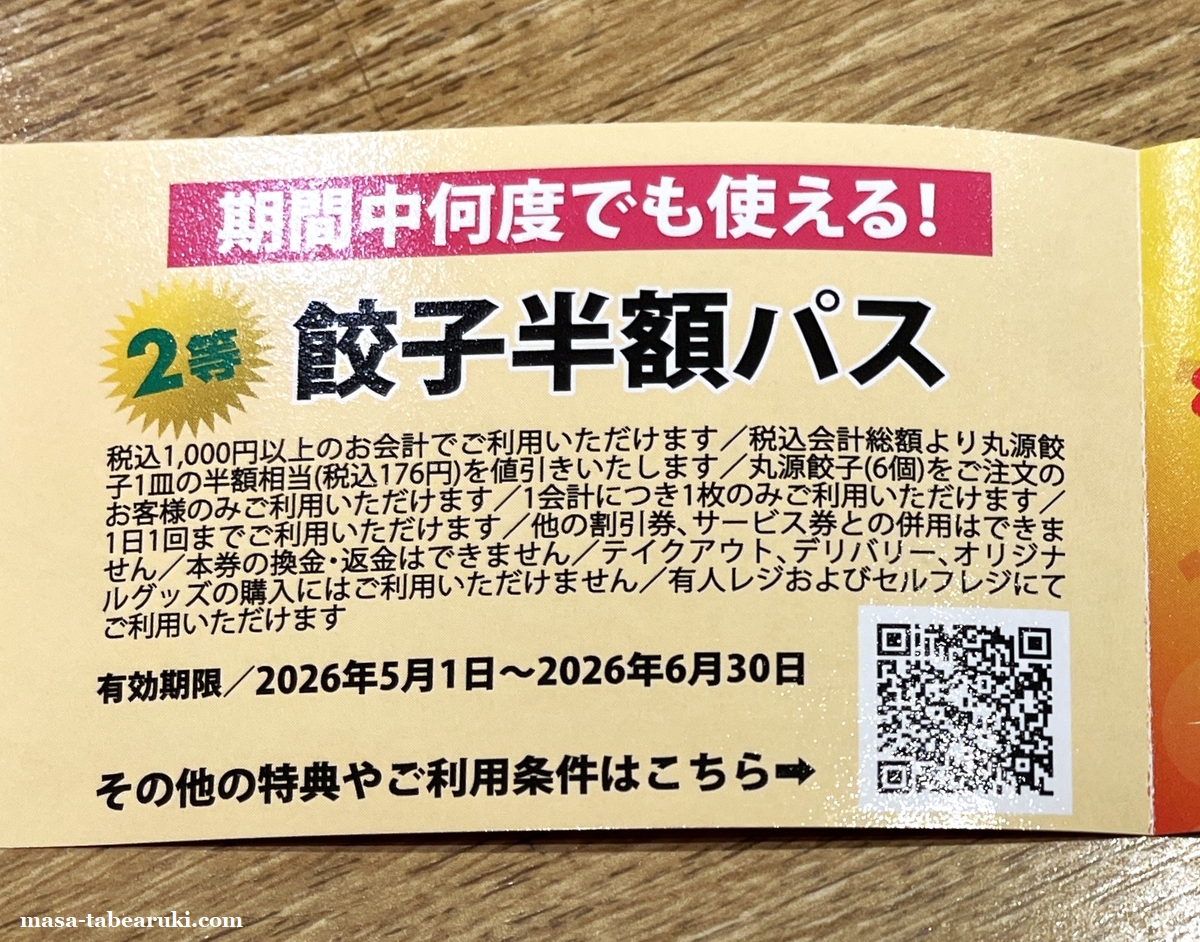 最後にこの日よりこんなキャンペーンをされていました。ハズレナシのパスポートくじで訪問したこの日より配られていた模様。期間中に何度でも使用できるパスポートで(条件は色々あるけど)、期間も5月1日から6月30日までと2カ月と長め。1等はなかなかお得ですが、私は引いてみると2等。餃子半額パスですが、これもお得ですね。しかも2等とはなかなかいい結果(笑)