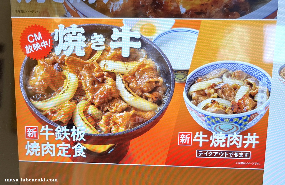 どうやら訪問したこの日(2026年4月2日)より発売となったようで、メニュー名は「牛鉄板焼肉定食」。他に牛皿もセットになった「ダブル定食(牛皿・牛鉄板焼肉定食)」や丼ものの「牛焼肉丼」、テイクアウトの「ダブル弁当(牛皿・牛焼肉弁当)」もあります。