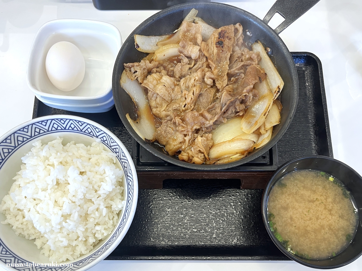 通常の定食は鉄板焼肉以外にご飯、みそ汁、生たまごが付属しており、ちょうど「牛皿定食」と同じような形での提供となっています。またダブルのほうには生たまごは付いていないようですね。鉄板焼肉はジュージューと音を立てながら湯気も上がっており香ばしい香りもして、いかにも食欲を刺激するような見ため。