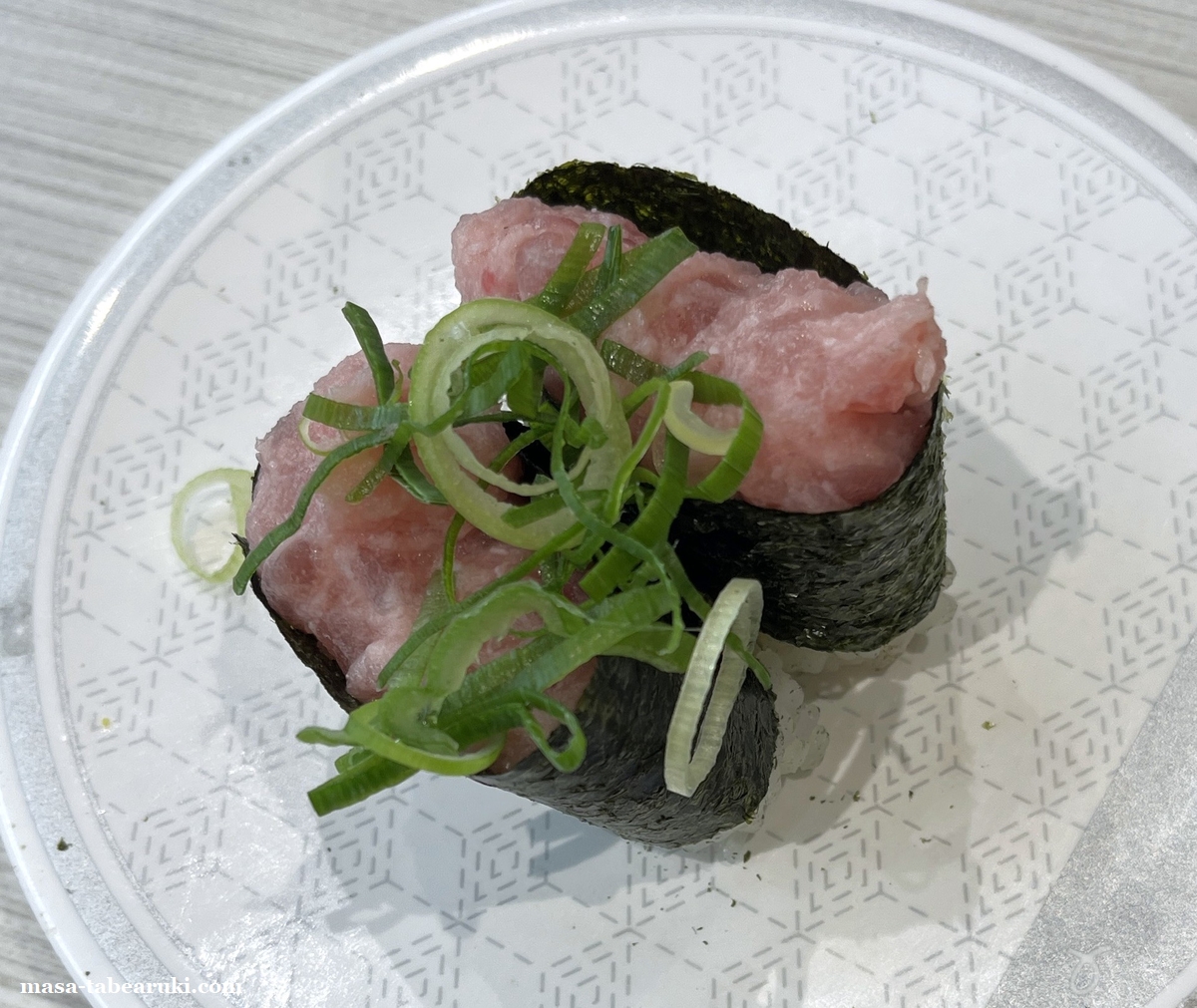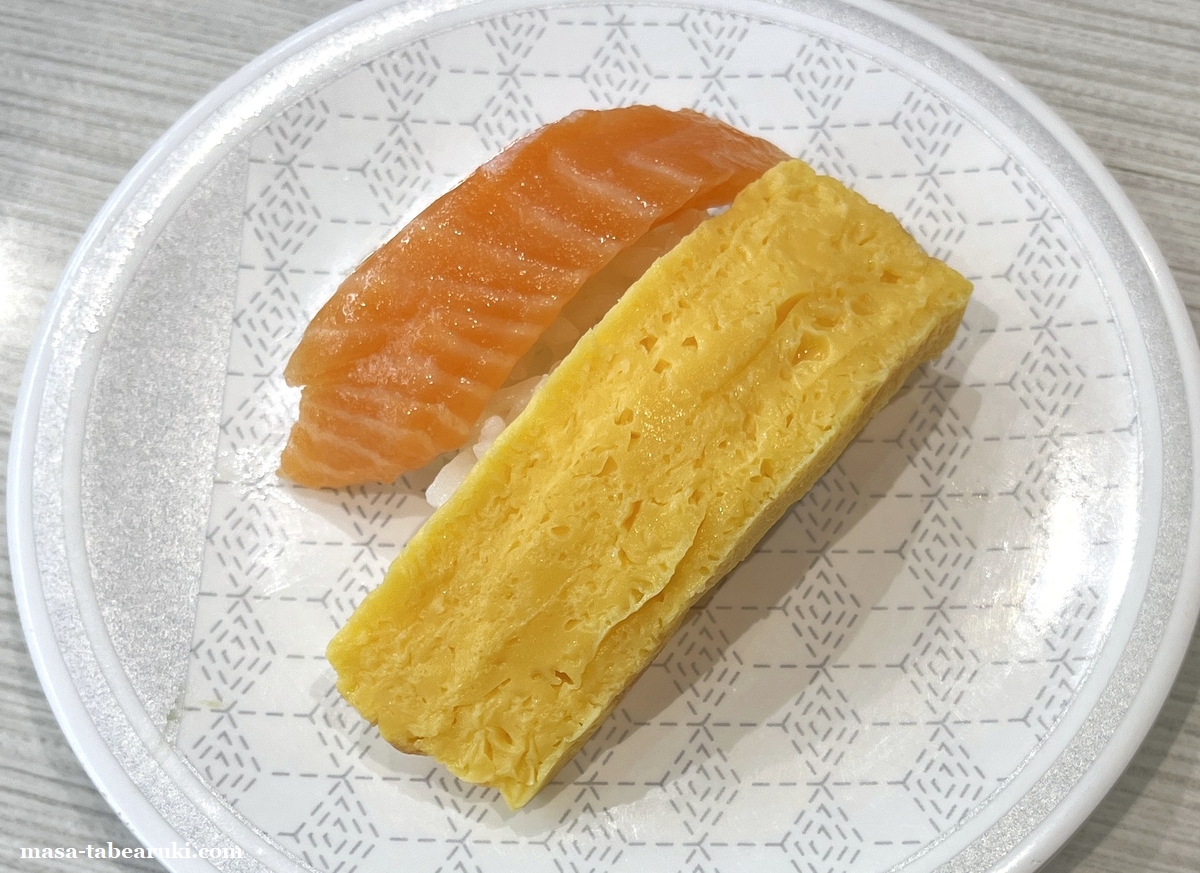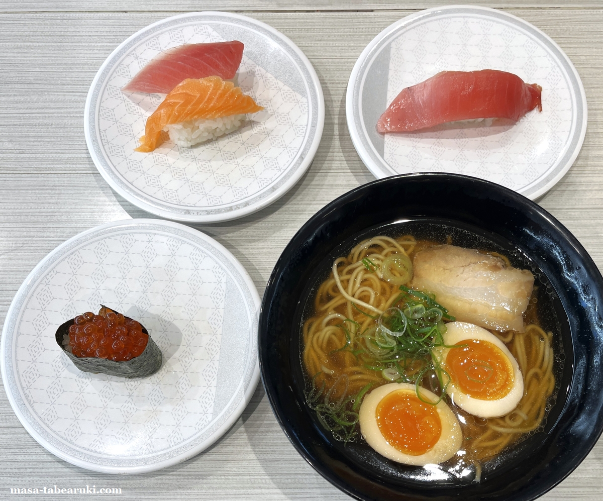 まず頼んだのは朝限定の「まぐろ・サーモン2種盛」。朝限定の寿司はすべてこの2種盛となっています。しかしそれ以外の通常も販売されているので今回はちょっと高めの160円皿である「中とろ」と「いくら」も注文。そしてこれも朝限定となる「朝ラーメン(醤油)煮玉子のせ」も頼んでみました。ここまでで合計金額は税込891円です。