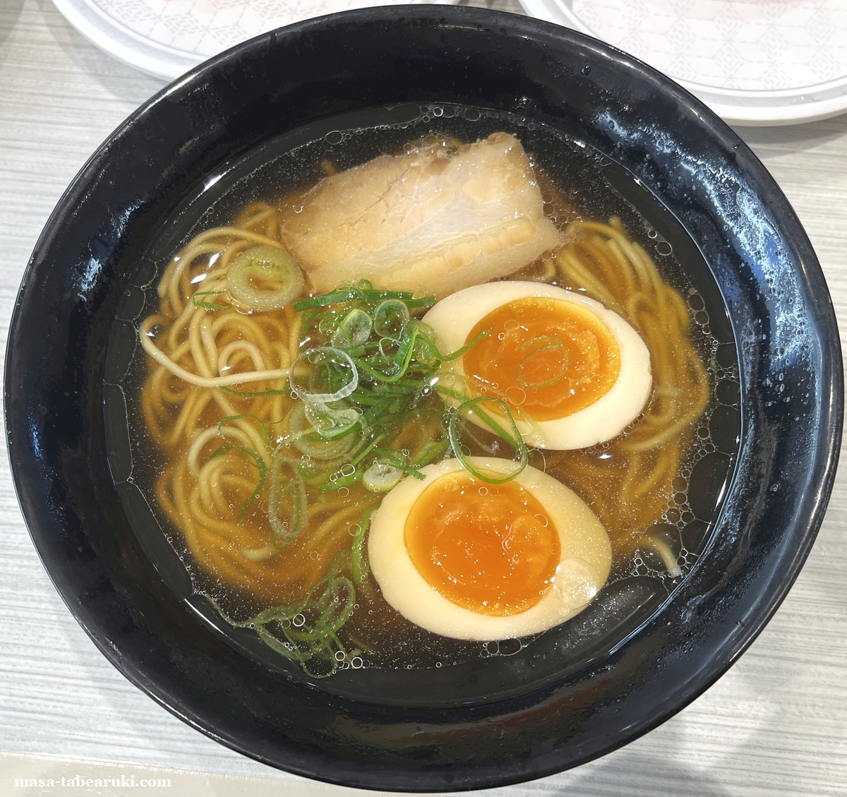 朝ラーメンはあっさりめの醤油スープで食べやすい一杯。今回は味玉付きにしましたが、個人的にはま寿司のラーメンの味玉は味がしっかりと染みて結構好きなほうですね。