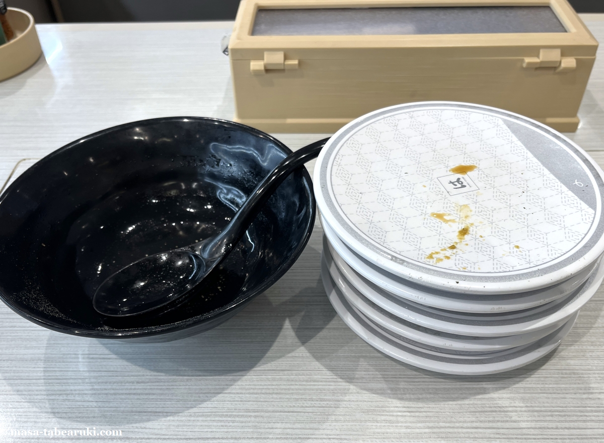 結局、429円のラーメン、110円の寿司3皿、160円の寿司2皿で合計税込1,111円。朝食として考えたらかなり高い金額となりました。