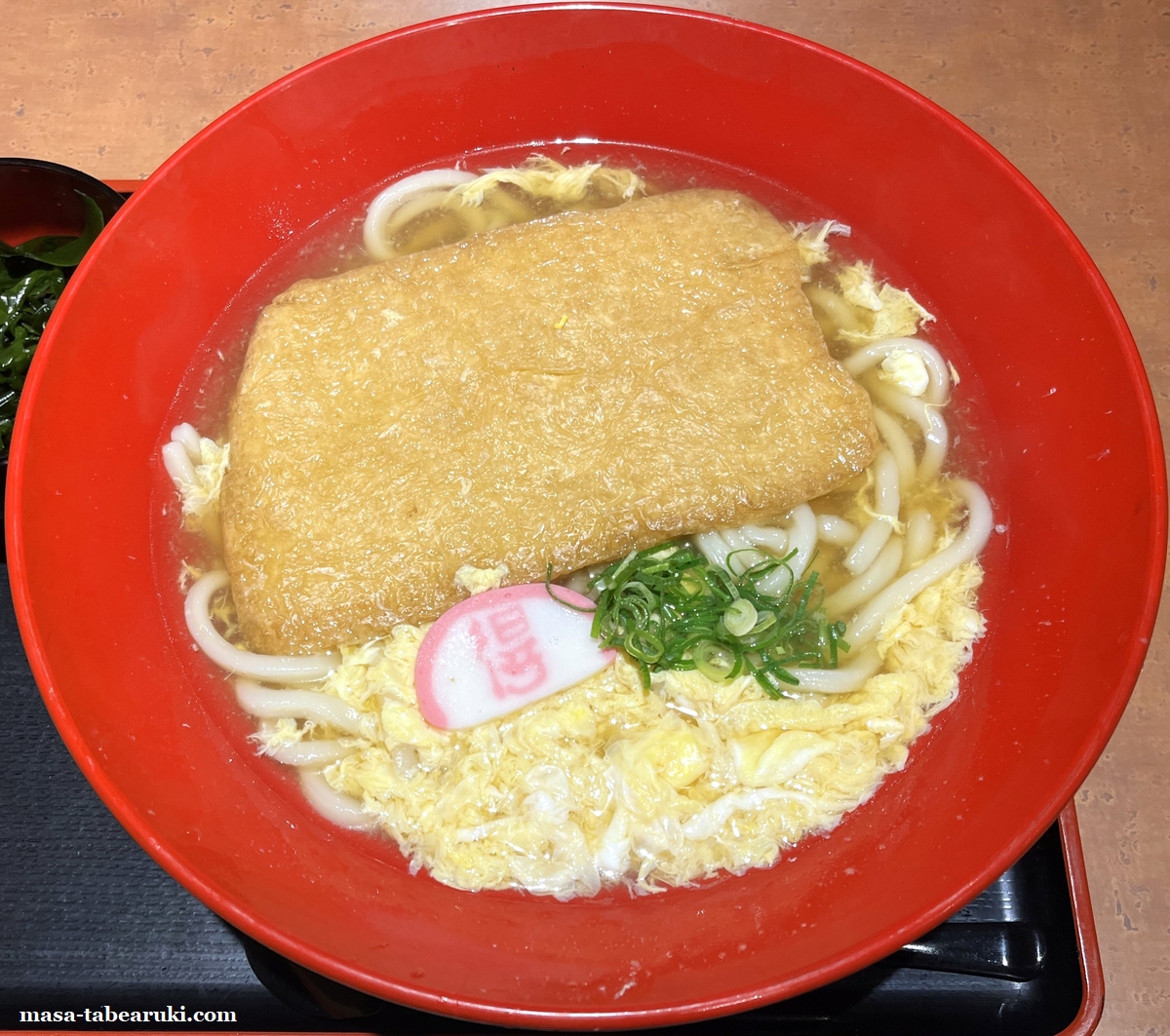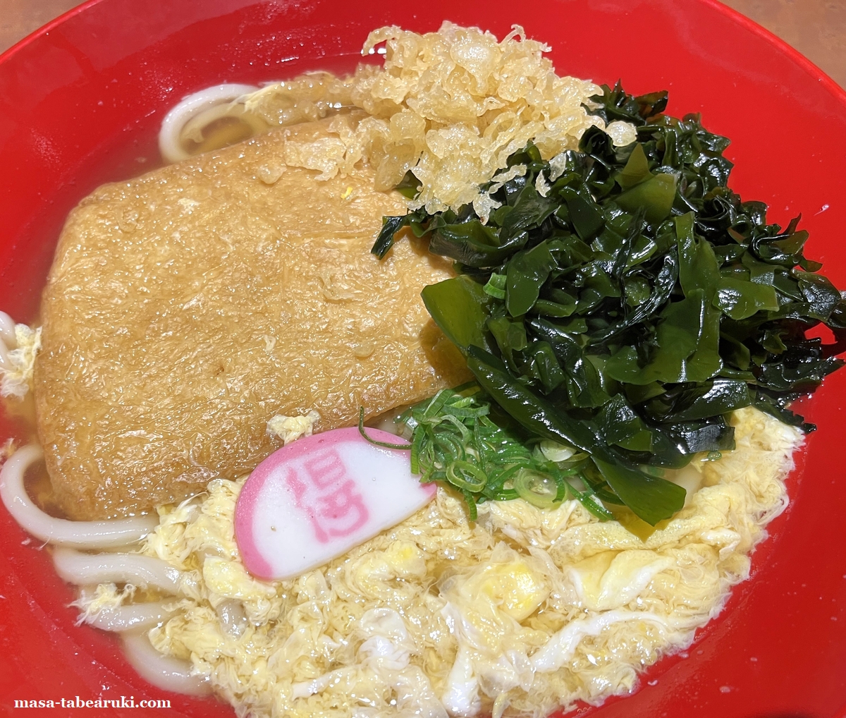 最近は具が載っているうどんで3玉にすると、ご飯ものまで頼むとちょっと多いくらいなんで今回は単品で注文しています。いつものきつねうどんにふわっとした玉子が浮いている状態で、他に具材は大判というだけあるデカく味をしっかりと含んだ食べ応えのあるきつねと少量のネギ、かまぼこ。