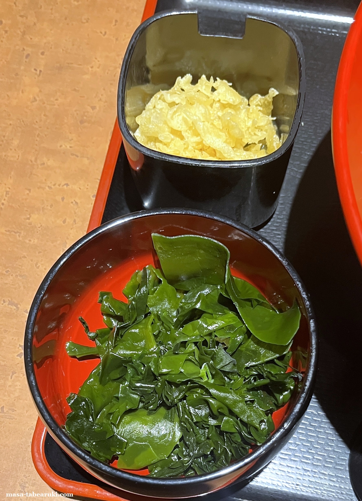 しっかりとクーポンとセルフコーナーも利用しましょう。わかめはLINEのクーポンで毎回使用できて無料になるのが、わかめ、生たまご、ミニわらびもちのうちからひとつ。今回はわかめにしましたがそこそこ量もあって良い具材になります。天かすはセルフコーナーに置いてあるのでこれも利用。ネギもあるので足りない人はネギを取るのも良いかと。ちょっとだけ豪華に?なったような気がします(笑)