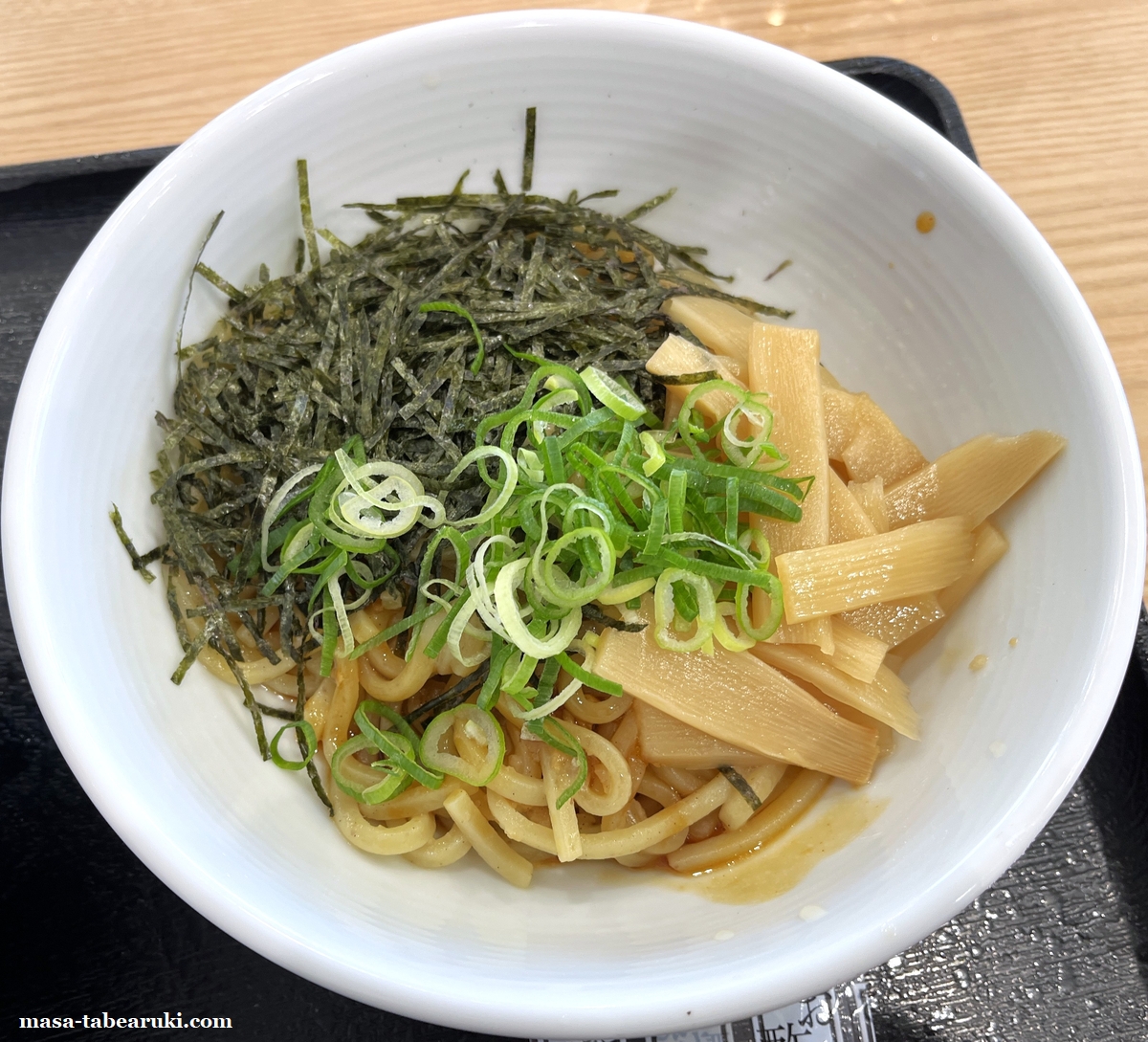 油そばに載っている具材は刻み海苔、メンマ、ネギとシンプルで、タレは脂と醤油、そしてにんにくと胡椒が効いたものとなっていますが割りとあっさりめのタイプ。