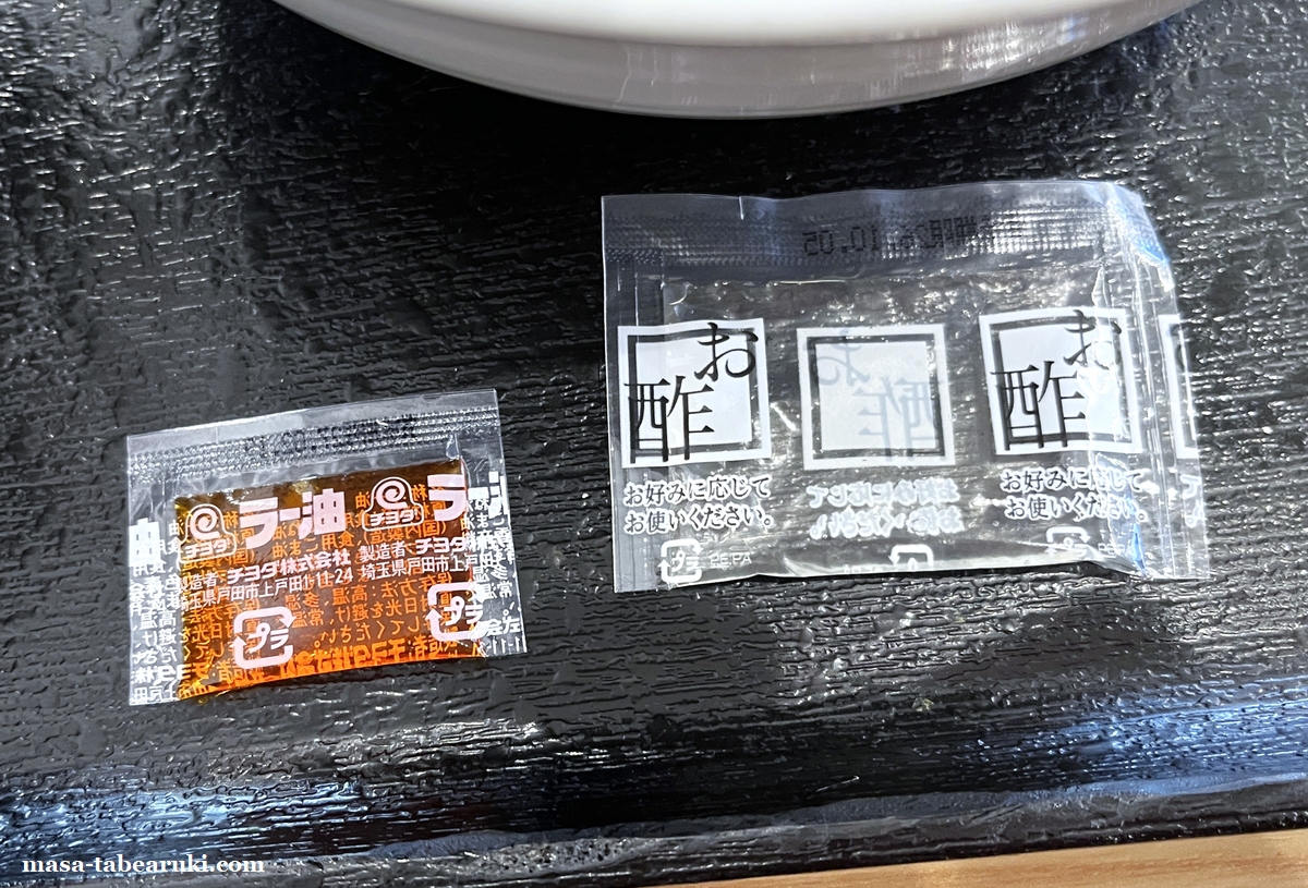 個人的に丼ものと麺類の組み合わせが好きなんですが、丼ものと合わせる麺はスープありの方がどちらかというと好み。セットにはラー油とお酢の小袋も付属しています。
