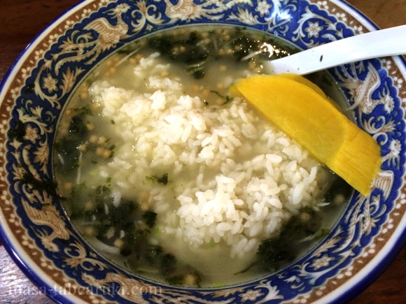麺や具材を食べてしまった後、残ったスープにご飯を投入。塩スープの味と山葵の風味がして、海苔やあられも入っているので、塩茶漬け風に食べられます。これも〆ご飯としてはいい感じです。意外にお腹も満足できました。
