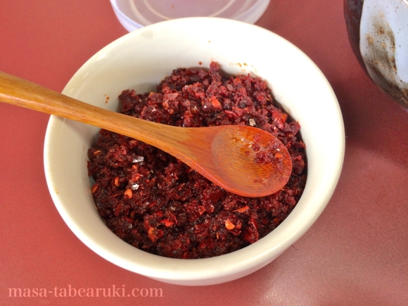 ラーメン到着時に一緒に持って来られた辛味噌です。この木のさじに軽く一杯くらい入れましたが、辛さと旨味が増します。そこそこ辛いので入れ過ぎには注意が必要かも。