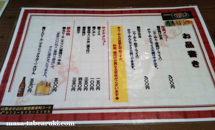 今日は北区での仕事。終了後、本日のラーメン屋さんはだいたい決めていた。千本通を南下して丸太町付近でと考えていたので、こちらのお店か、担々麺のお店かに絞っていた。仕事の終了時間によるので、現地近くに着いたときにはもう15時頃。担々麺のお店は15時までだったのであきらめ、通しでやっているこちらにした。