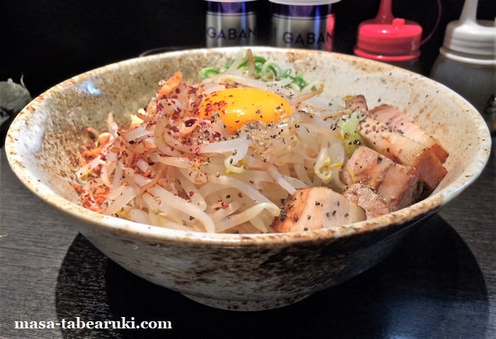 チャーシューはブロック状にカットされており、しっかりした食感があります。また炙られているため香ばしさも。具材は前述通りで卵黄、ネギ、モヤシなどとなっており、モヤシの量は多めに思えます。