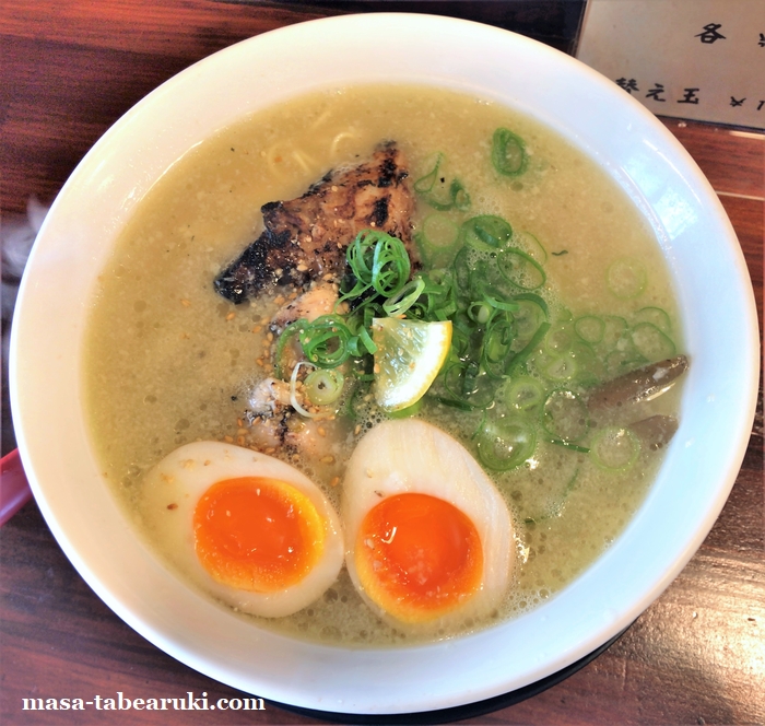具材はいつもと変わらずでチャーシュー2種にネギ、カットされたレモンと牛蒡。味玉は別トッピングなので通常は付いていません。