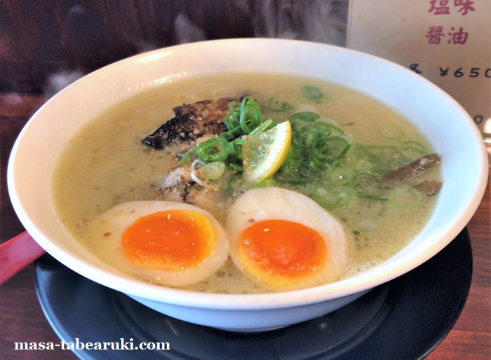 カウンター席に着いてメニューに変更は特に無かったので、一番好みの塩味を注文。サイドも検討しましたが、今回は替玉にすることに決めたので味玉のトッピングだけお願い。先ほどの団体さんも直前に入った様でしたので、いつもより少し時間がかかってラーメンの到着です。