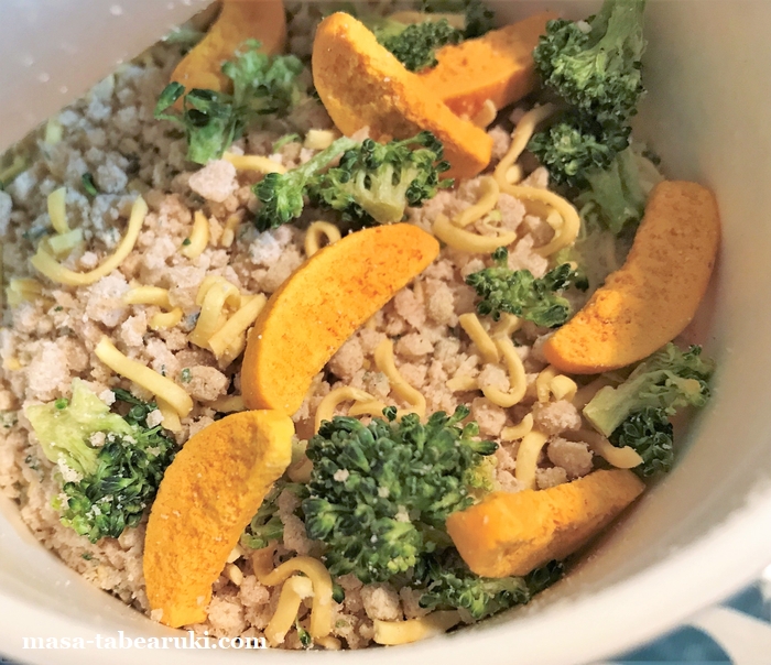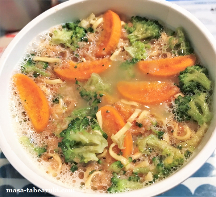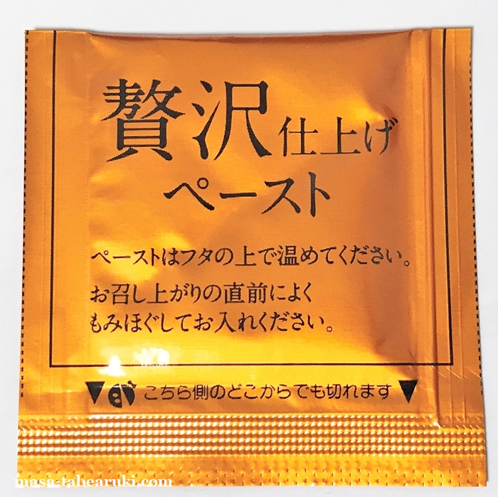 フタには小袋が貼りついており「贅沢仕上げペースト」と書かれています。カップの中身も確認するとブロッコリーらしい緑色のものと何やら「雲丹」っぽい形状をした黄色いものも見え特徴的な具材が入っているのが印象的。ではこれに熱湯を注いで待つこと3分で完成です。