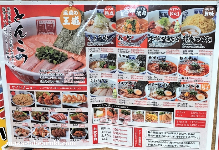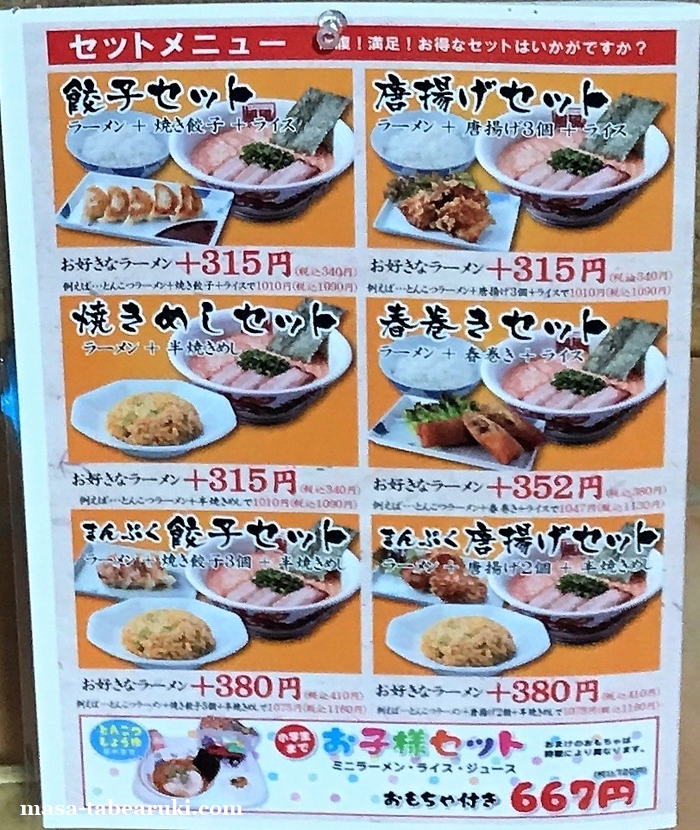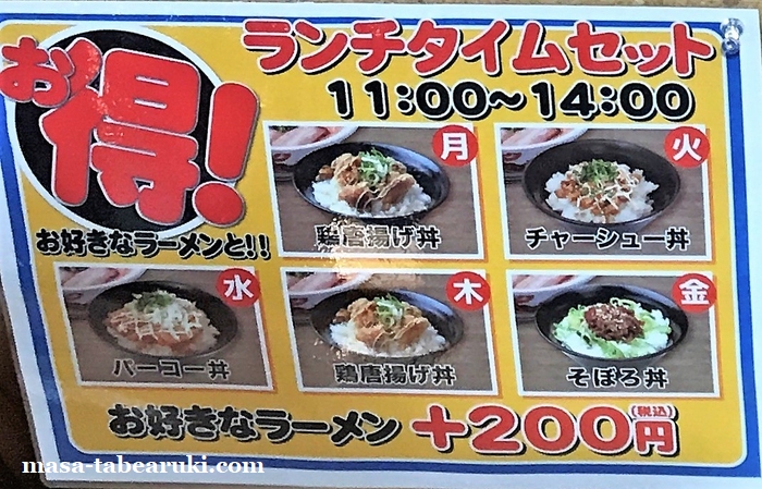 メニューはかなり豊富でメインはとんこつと思われますが、それ以外にも醤油、味噌、塩などもあり、さらに台湾ラーメン、担々麺、油そばやつけ麺も。セットの方も定番の餃子、唐揚げ、焼きめしや春巻き、まんぷくなどと多め。さらに平日には日替りの丼とのセットまであるとは。。しかしそれだけでは無く、さらに期間限定メニューも。