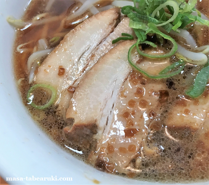 チャーシューは小さめサイズのバラ肉が3枚ほど。食感はややカタメ(バラにしては)で食べ応えももうひとつの印象。