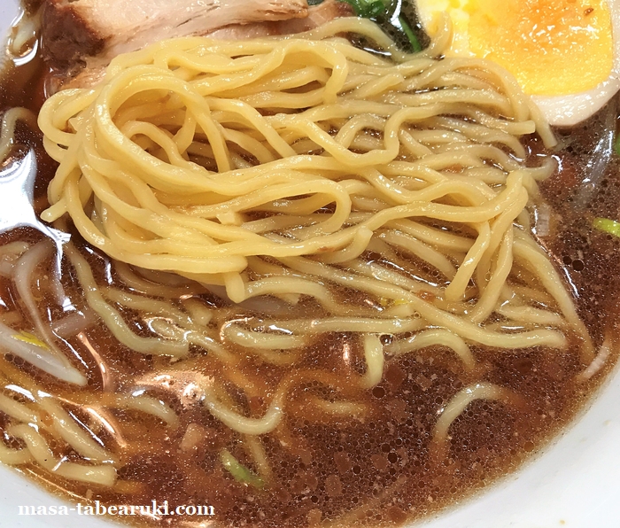 麺は黄色っぽい色で縮れも入っており、モチっとした食感もあります。スープは甘味の様なものも感じる醤油でじんわりとした旨味もあります。