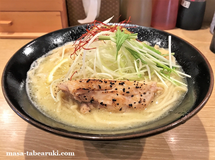 特大ですが丼はそれほど大きくはありません。具材は鶏チャーシュー、白ネギ、水菜、穂先メンマ、糸唐辛子、カットレモンとなっており、ブラックペッパーも少し振りかけられていました。
