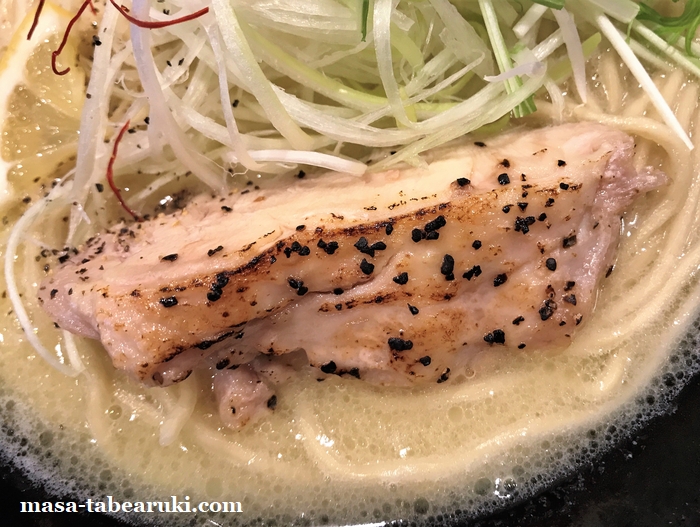 鶏チャーシューは分厚くカットされており、ひとつながらなかなか食べ応えもあります。少し炙られているのか香ばしさも感じられ食感は柔らか。