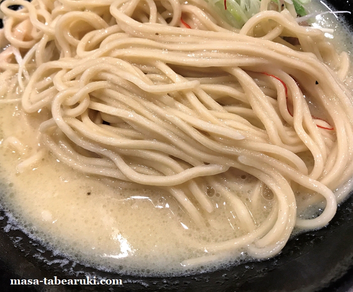 少し太めのしっかりとした食感の麺、スープは塩気それほど強くない旨みある鶏白湯の塩