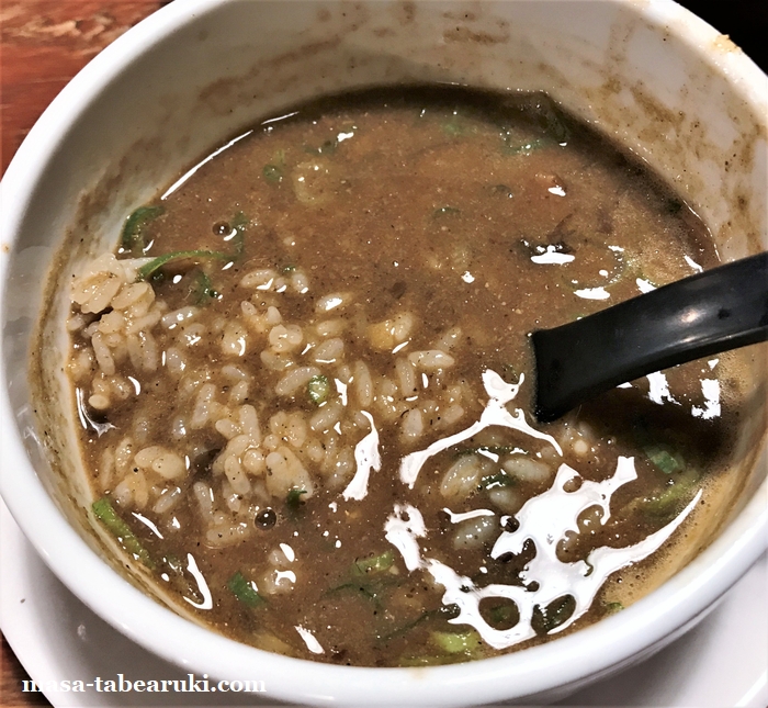 今回食べた濃厚白湯 煮干油薫る 泡ニボBLACK白湯つけ麺。こちらでは最近この形のつけ麺を限定で提供されていますが、個人的には麺に下味が入っているのがお気に入り。そのまま全部食べてしまいそうなくらいでした。モチロンつけ麺なので泡だった濃厚なつけ汁に浸けて食べても旨いのですが、そのまま麺を食べる方が多かったかも(笑)最後に〆飯で白湯スープも全部食べて完食。三度楽しめるつけ麺は2019年9月22日までの提供予定なので、記事公開時点であと1週間は食べられますね。1日15食限定ですので、早めの時間帯に行く方が良いかと思われます。