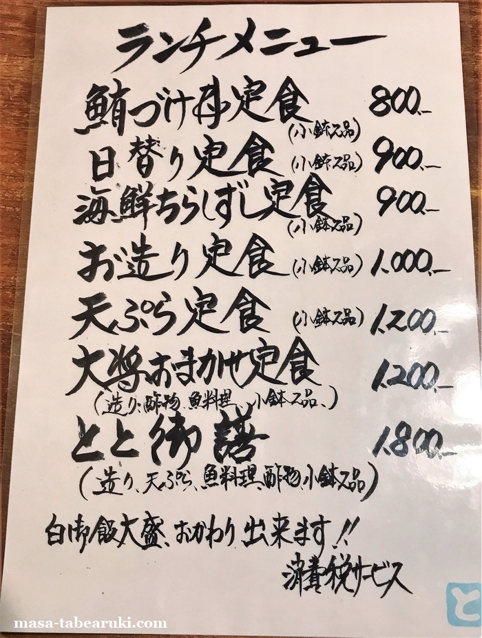 ランチメニューは鮪づけ丼定食を筆頭に、日替り、海鮮ちらしずし、お造り、天ぷら、大将おまかせ、とと御膳と変わっていません。しかし価格は消費増税があったにも関わらず据え置きで、消費税サービスとも書かれており、ご飯も大盛やお代わり出来ますとも。