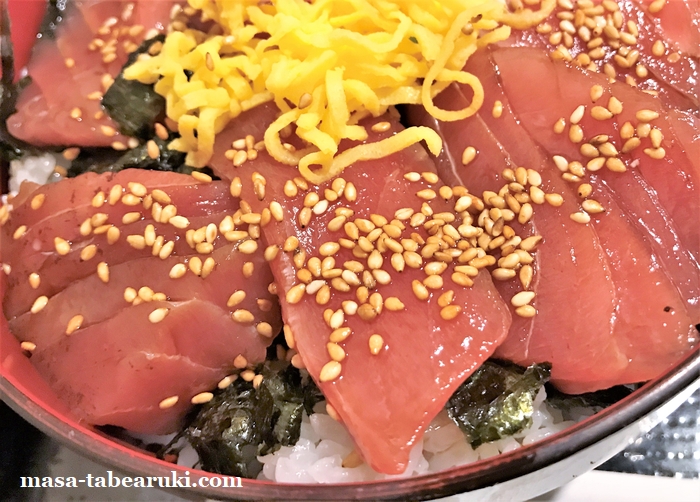 ”づけ”になった鮪もなかなかの量が載せられており、ご飯の上に刻み海苔と大葉、鮪の上には錦糸卵と胡麻。鮪のづけは深く浸けられてはおらずあっさりめ。鮪のスジもありますが、切り方が良いのか気になることも無く食べられました。