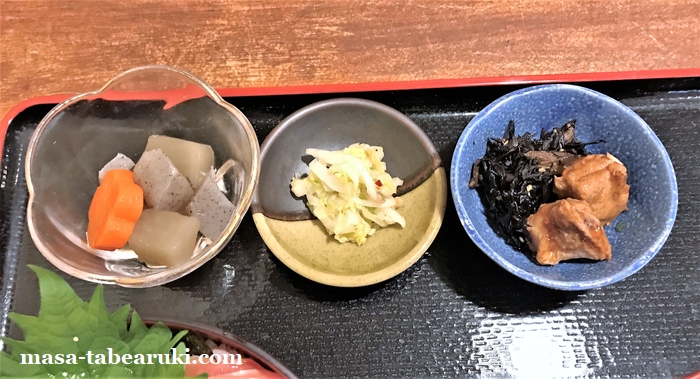 小鉢は2品付いています。大根、蒟蒻、人参の煮物とひじきと鮪を煮たもの?でしょうか。ひじきはやや濃いめの味付けに感じます。漬物は白菜でさっぱりとしていました。