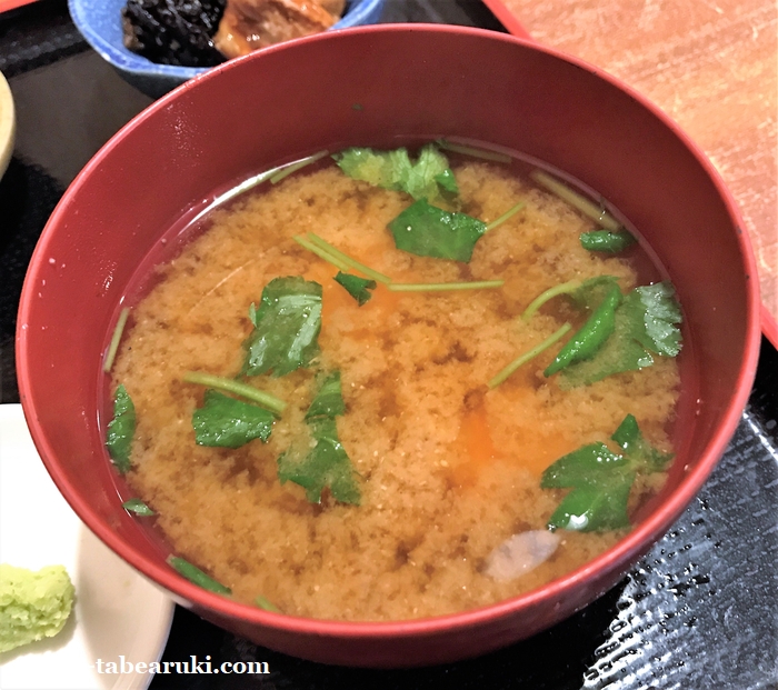 みそ汁も出汁や三つ葉の香りが効いて旨く、特徴的なのは山椒の風味がしているところ。味噌汁に山椒も合うもんですね。
