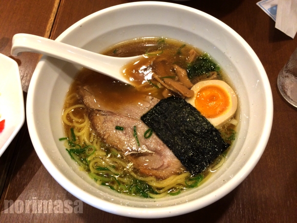つけ麺も用意されているようで、特製醤油つけ麺やちょっと珍しい、温かいのと冷たいつけ汁が付いた2色つけ麺なども。今回はとりあえず定番と書かれたものにして、それだけでは足らないので半チャーハンもお願いしてみました。注文してからもちょっと待って(10分ほど)ラーメン到着です。