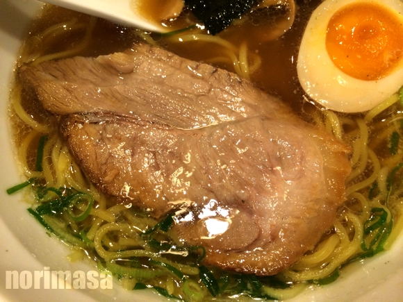 麺は中細ぐらいで少しウェーブがかっています。色は黄色く、茹で加減は何も言わなくてもカタメ。嫁さんもちょっと変わった麺と言ってました。スープは豚と鶏を使い、マグロ節、真昆布を使用とHPには書かれています。飲んでみるとマグロ節かどうかは私にはわかりませんが、魚介でも確かに変わった風味に思えました。和風ラーメンというのも分かる気がしますね。