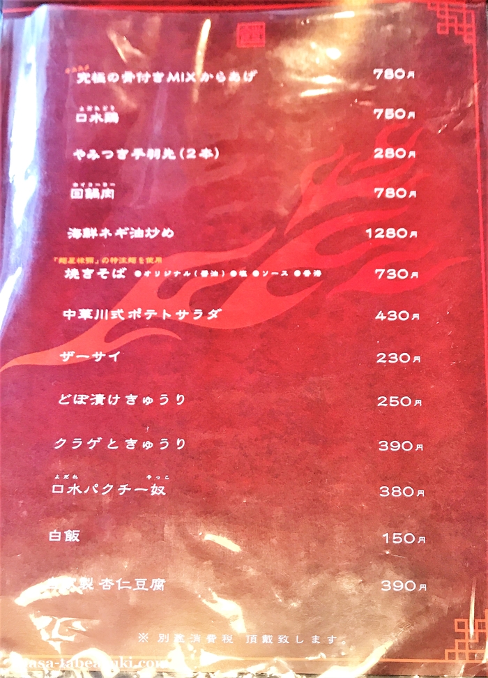 大きく記載されたメインはもちろん「麻婆豆腐」。それ以外にも回鍋肉や手羽先といった一品や居酒屋的なメニューも記載されています。