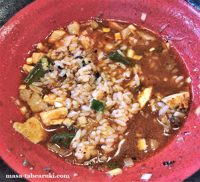 麺を食べ切ると付いていたライスに麻婆豆腐を載せて食べてみましたが、これはこれで良いのですが、やはりご飯を丼にぶっこんだ方が旨い気がしたので投入。