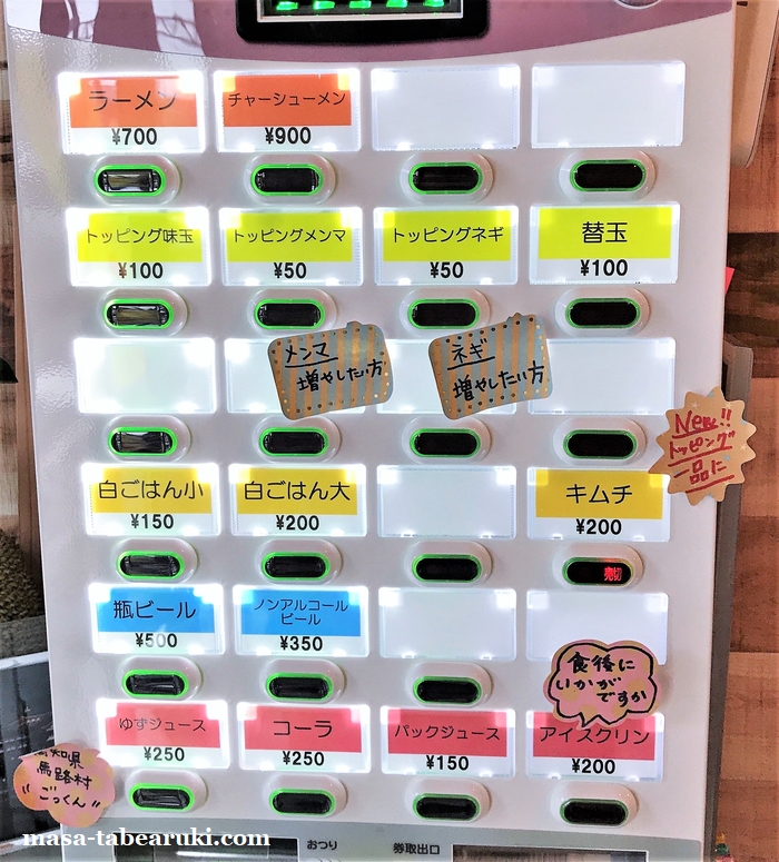 入店してスグ左手に券売機がありました。ラーメンは非常に潔く1種類のみ。他にはチャーシューメンだけを提供されています。トッピングに味玉、メンマ、ネギなどがありますが、サイドも無くご飯のみと言う潔さ。