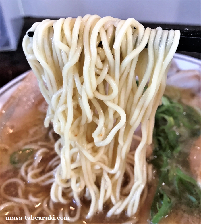 麺は少し縮れも入った細めのタイプで、茹で加減は柔らかすぎずの硬すぎず。スープは背脂がタップリと浮いており、鶏ベースかと思われ塩気は少し優しめに思えました。最近は暑くて汗をかきまくっているので、そう感じたのかもしれません。