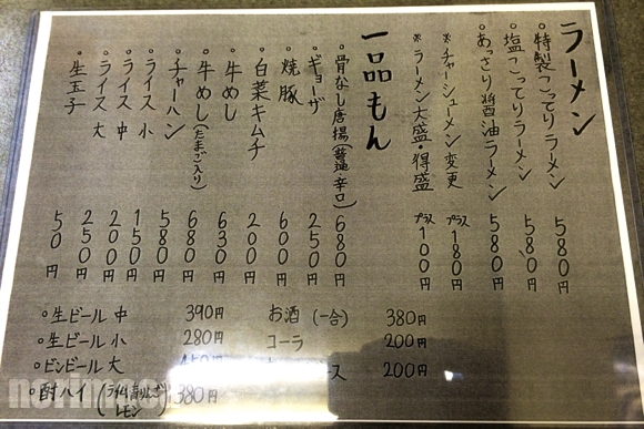 ラーメン自体は特製こってり、塩こってり、あっさり醤油とそれほど多くは無いですが、一品物や定食の数はなかなかあります。「名門」で良く見かける「牛めし」も健在。それに全体的に価格も安く、コスパもかなり良さそうです。しかし今回は朝から胃の調子もあまり良くなく、時間も遅いのでラーメン単品でお願いすることに。待つこと5、6分での到着です。